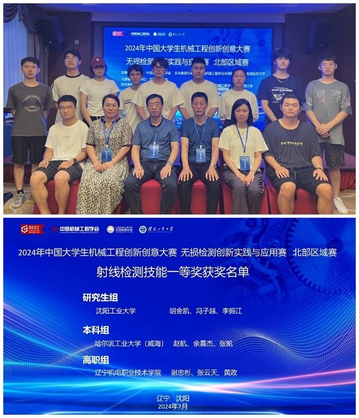 7月24日至27日,由中國機(jī)械工程學(xué)會主辦,沈陽工業(yè)大學(xué)承辦的全國無損檢測創(chuàng)新實(shí)踐與應(yīng)用賽北部區(qū)域賽圓滿落下帷幕。我校學(xué)生謝忠彬、張?jiān)铺?、黃政組成的團(tuán)隊(duì)在教師韓雪的指導(dǎo)下榮獲射線檢測賽項(xiàng)一等獎(jiǎng);學(xué)生肖方劍、于曉涵、張?jiān)婄鹘M成的團(tuán)隊(duì)榮獲二等獎(jiǎng)。學(xué)生馮泊遠(yuǎn)、劉志卿、劉琦組成的團(tuán)隊(duì)在教師王洋的指導(dǎo)下榮獲超聲檢測賽項(xiàng)二等獎(jiǎng)。學(xué)生馬欣源、周俊鵬、李美潼組成的團(tuán)隊(duì)及楊鈺坤、金子琪、杜文博組成的團(tuán)隊(duì)在教師崔國建、趙玲的指導(dǎo)下榮獲滲透檢測賽項(xiàng)三等獎(jiǎng)。