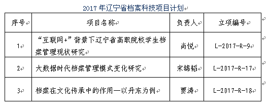 根據(jù)遼寧省檔案信息網(wǎng)“遼寧省檔案局辦公室關(guān)于印發(fā)《2017年遼寧省檔案科技項(xiàng)目計(jì)劃》的通知”獲悉,我院有三位教師的項(xiàng)目被確定為2017年遼寧省檔案科技項(xiàng)目。